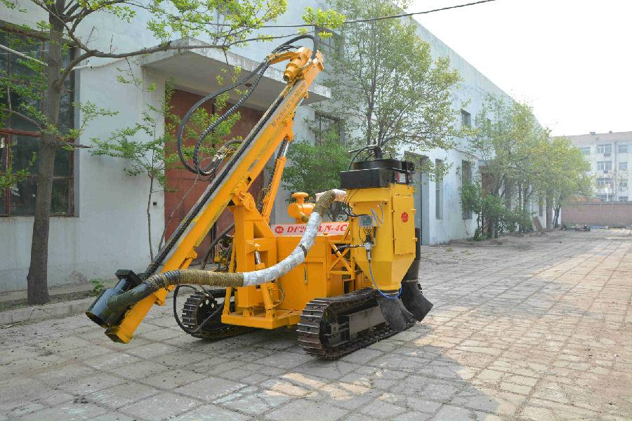 該系列履帶式潛孔鉆機主要用于露天礦山及石方工程鉆鑿下向傾斜爆破孔作業。該鉆機采用內燃機(或電動機)油泵組為動力,液壓馬達行走、回轉,液壓馬達鏈條推進及提升,油缸擺角定位,傳動結構簡單,易損件少,耗氣量低。